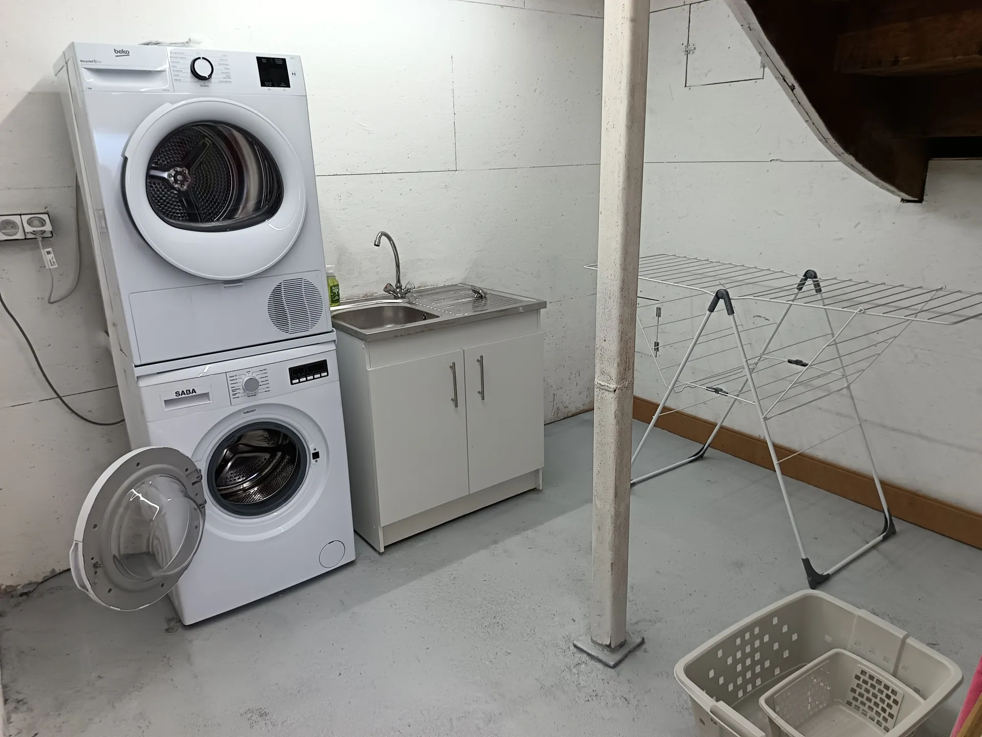 Sous -sol : lave-linge, sèche-linge, évier, matériel de repassage, local pour entreposer matériel sportif. accès intérieur et extérieur.